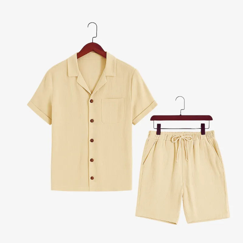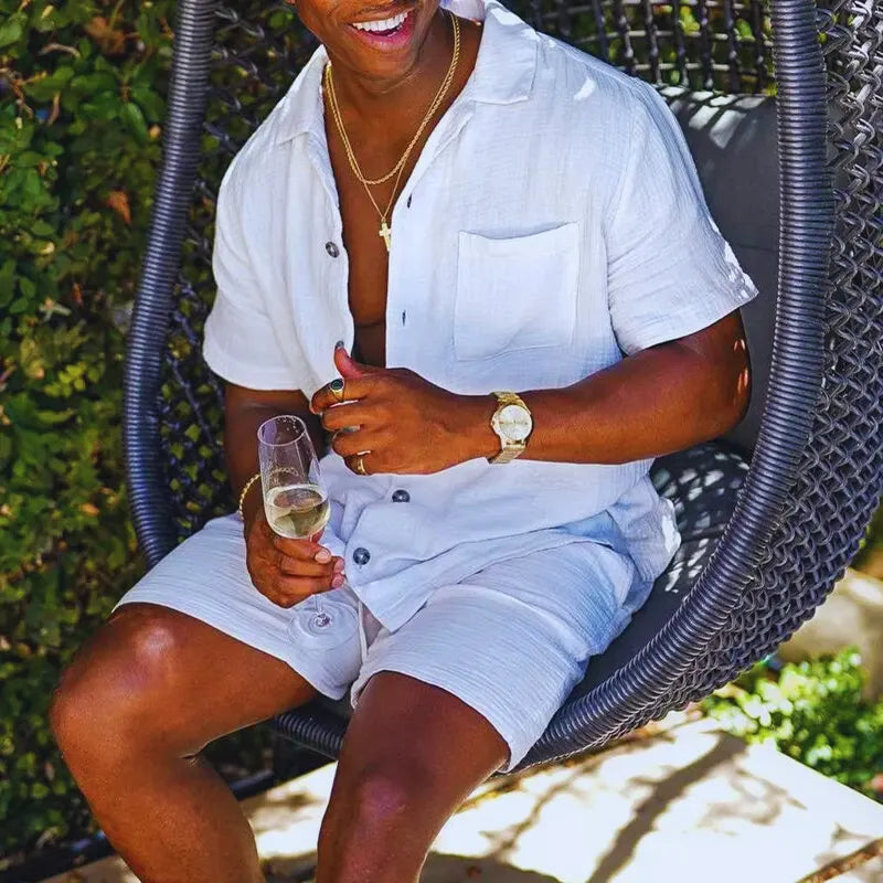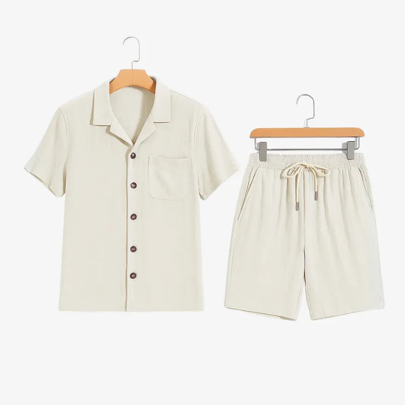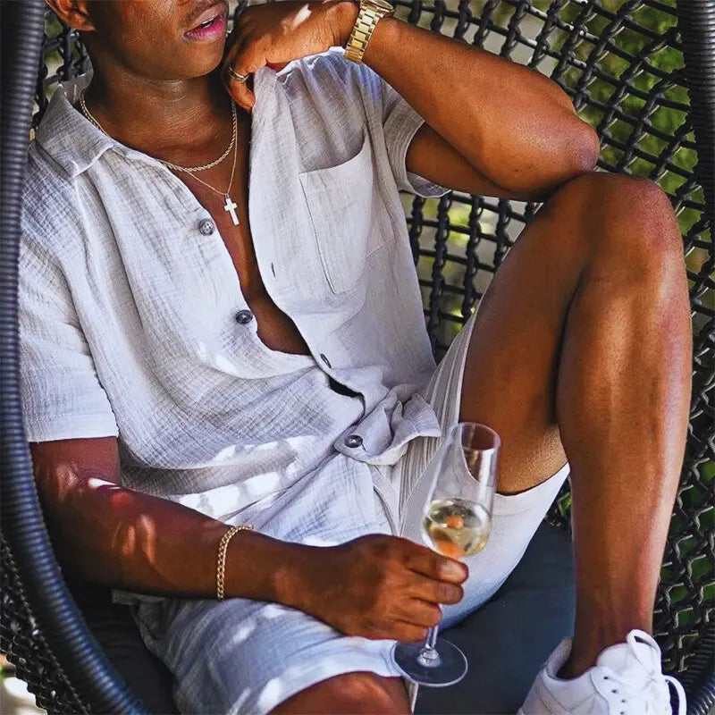 Crafted from a premium cotton-linen blend, this set offers superior breathability and a luxuriously lightweight feel, making it your ideal companion for warm days and elegant escapes across Europe. The V-neck, short-sleeved shirt features a relaxed, loose fit and a classic single-breasted closure, exuding an air of understated charm. Paired with matching drawstring shorts for adaptable comfort, this set is perfect for beach holidays, casual gatherings, or simply enjoying refined leisure. The Nauvik Linen Breeze Set brings an authentic touch of Old Money elegance to your summer wardrobe, proving that true style is always at ease.